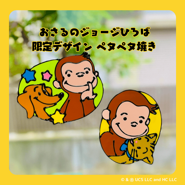 大人気のペタペタ焼き体験キットに、おさるのジョージひろば限定デザインの2種類を新たに追加!ジョージとハンドリーが並んだお星様がカラフルなデザインと、ジョージとニョッキが寄り添っている愛らしいデザインです。