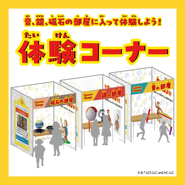 ジョージのお話をもとにした体験ブースを用意!ジョージもなんで?と考えたことをいっしょに感じられる空間をお楽しみください。