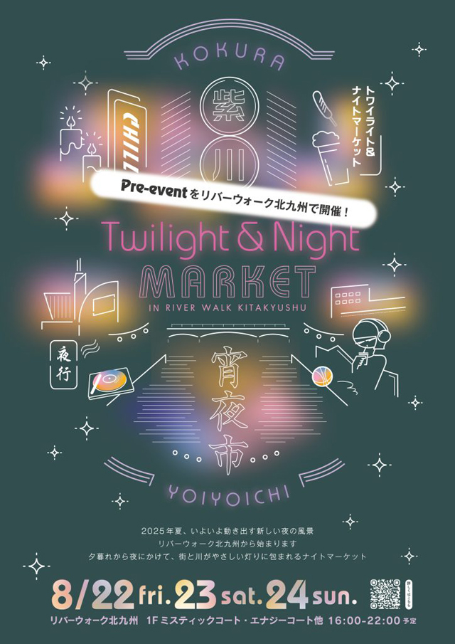 2025年8月22日(金)~8月24日(日)16:00~22:00(予定)、リバーウォーク北九州(北九州市小倉北区室町1-1-1)1F ミスティックコート・エナジーコート他にて、「紫川トワイライト&ナイトマーケット -紫川宵夜市-」が開催されます。