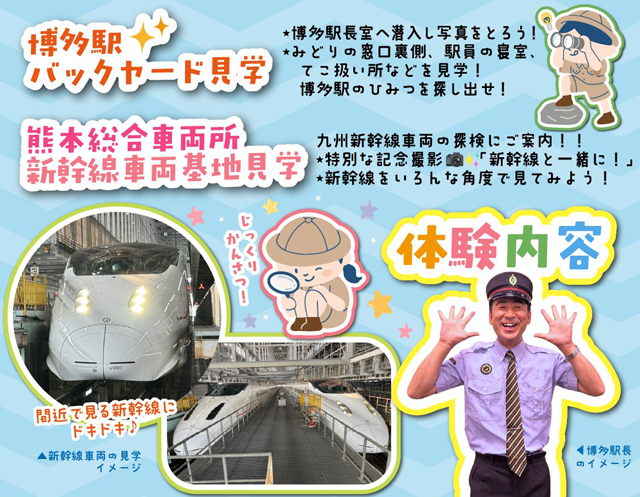 ・博多駅長と一緒に、博多駅バックヤード見学や新幹線の車両基地見学に案内!博多駅では、普段入ることのできない駅長室、みどりの窓口の裏側、駅員の寝室、てこ扱い所などを見学します。 新幹線の車両基地「熊本総合車両所」では、検修設備や新幹線車両の見学に案内します。