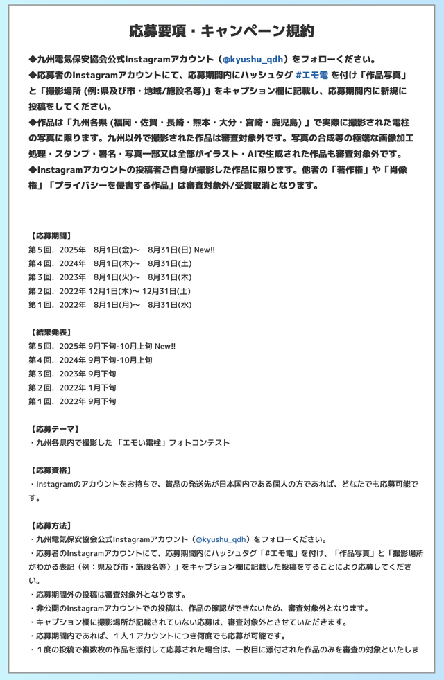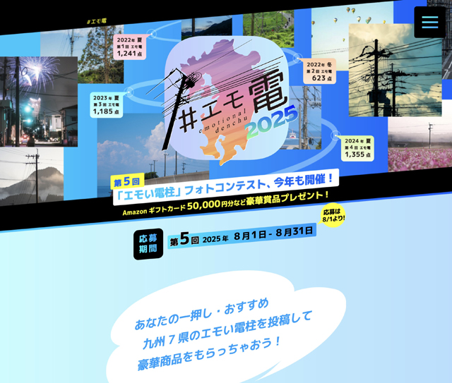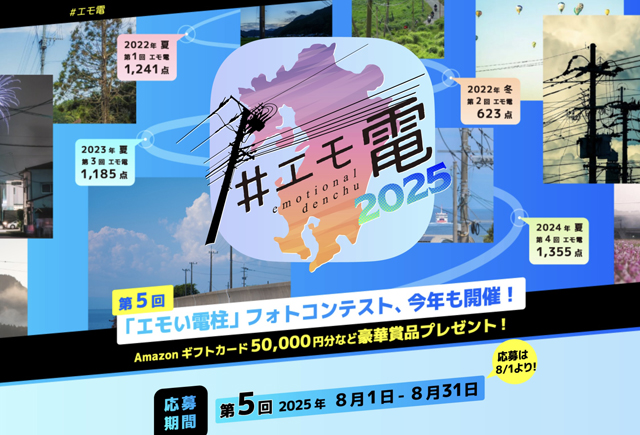 2025年8月1日(金)~8月31日(日)の期間「第5回 エモい電柱フォトコンテスト2025」が今年も開催されます。過去に実施したエモ電フォトコンテスト(第1~4回)では、九州7県の皆様を中心に、応募総数4,404点もの作品の応募がありました。