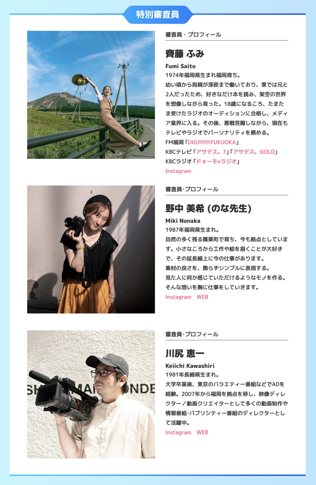 特別審査員には、昨年4月からの新企画「エモ電旅 -電柱パチリ部-」にも参加されている、タレントで福岡のテレビ番組・ラジオパーソナリティーでおなじみの斉藤 ふみ氏&写真家の野中 美希(のな先生)氏、動画クリエーター&福岡の情報番組を中心に手掛ける番組ディレクターの川尻 恵一の3名が担当します。