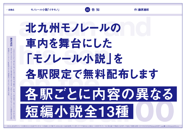 モノレール全13駅で、各駅ごとに内容の異なる、約1000文字程度の短編小説を配布。すべて集めると、企救丘から小倉まで移動するある親子の物語となります。