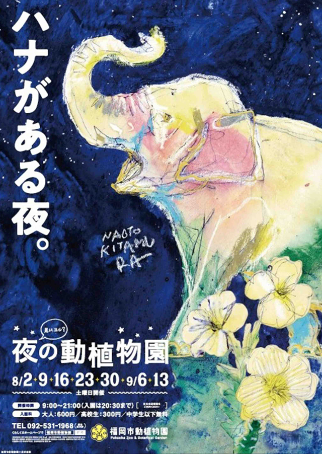 今年は、昨年7月に仲間入りしたアジアゾウの夜の姿を初めて見ることができます。毎年メインビジュアルを手掛けていただいているアーティスト北村直登さんによるライブペインティングも行います。
