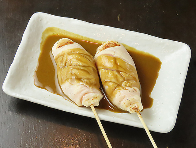 とり皮の次におすすめの「しぎ焼き」です。低温調理済のささみをさくっと表面を焼いて、かわ屋秘伝の特製わさび醤油につけて召し上がり下さい。