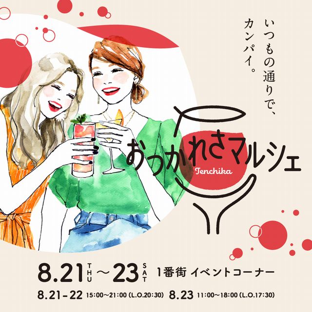2025年8月21日(木)~8月23日(土)天神地下街1番街イベントコーナーにて、「おつかれさマルシェ」が開催されます。開催時間は、8月21日(木)~8月22日(金)15:00~21:00(L.O.20:30)、8月23日(土)11:00~18:00(L.O.17:30)。