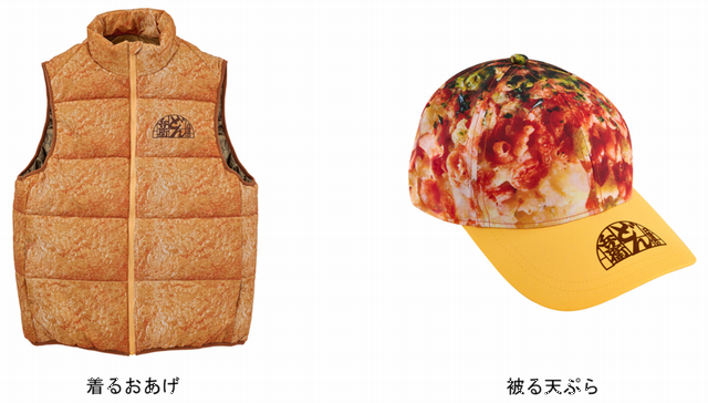 「どん兵衛」の人気具材を再現したオリジナルグッズを合計1,000名にプレゼント。賞品には、「どん兵衛」のふっくらおあげに包まれたような暖かさを体感できるダウンベスト「着るおあげ」と、”あとのせサクサク” の天ぷらをデザインした彩り鮮やかなキャップ「被る天ぷら」を用意。