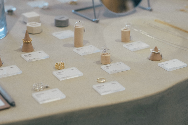 オンラインでは難しい着用感やサイズ感を、実際に手に取って確認できます。サイズ調整可能なリングやピアス、バングルなど、日常使いしやすいデザインを多数用意。
