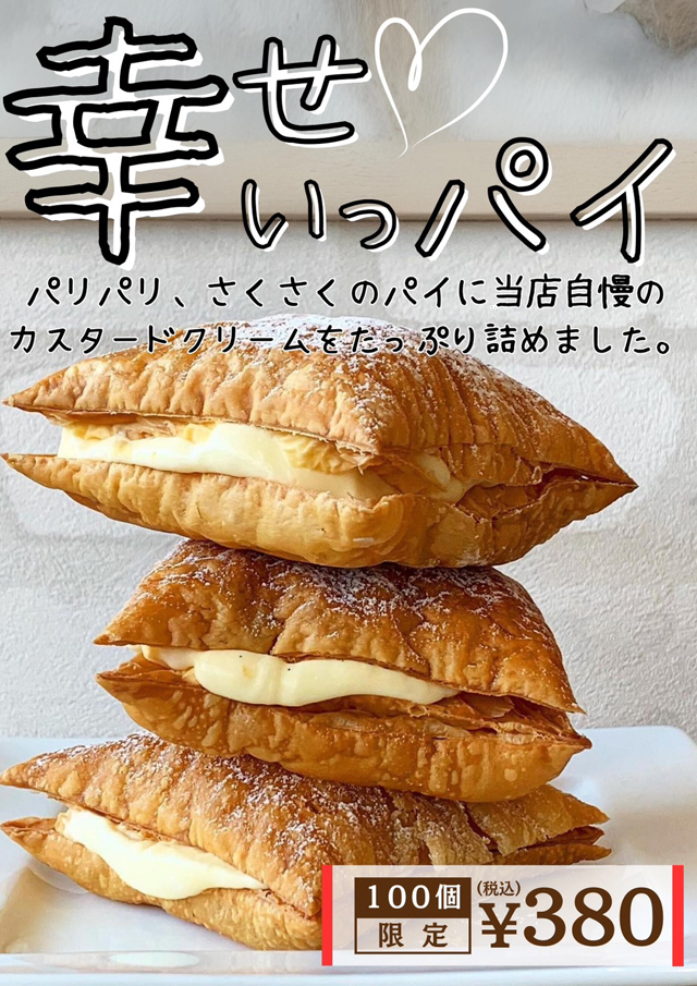 そして毎回大人気の「しあわせいっパイ」はサクサクのパイ生地で包まれ、一口食べれば口の中に広がるカスタードが幸せな味わいをもたらしてくれ、食べた人を感動させる絶品スイーツです。