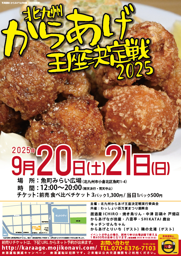 2025年9月20日(土)~9月21日(日)12:00~20:00、魚町みらい広場(北九州市小倉北区魚町1丁目4-16)にて「北九州からあげ王座決定戦2025」が開催されます。