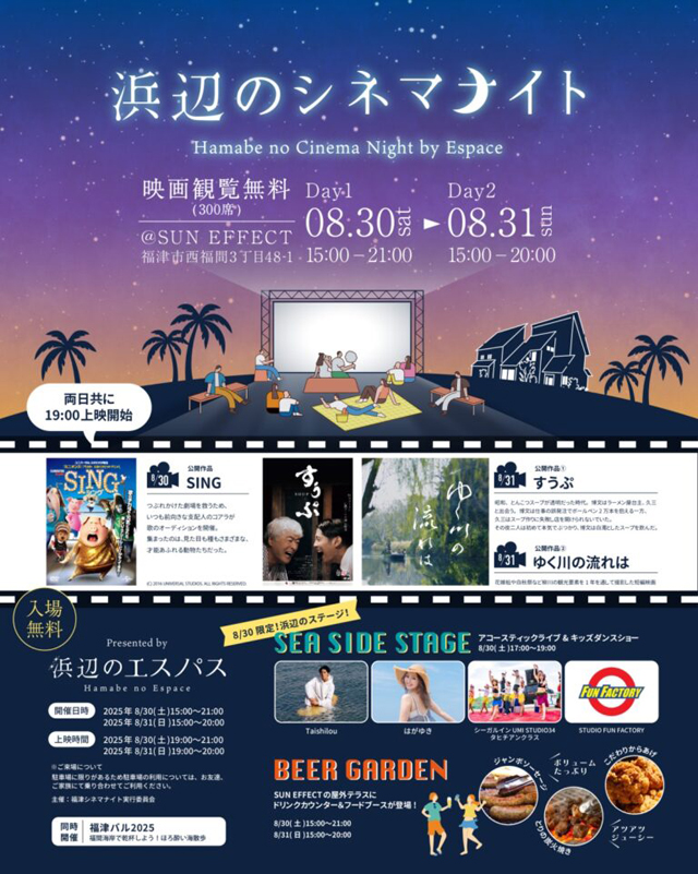 さらに、夕暮れ時の音楽ライブや野外映画など、夏の夜を彩る観覧イベントも同時開催。当日はビーチにも椅子やテーブルを設置予定です。