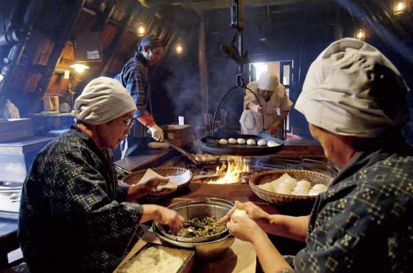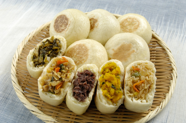 信州長野県の郷土食。野菜や山菜、果物などを小麦粉に包んだ具たくさんのおやきです。