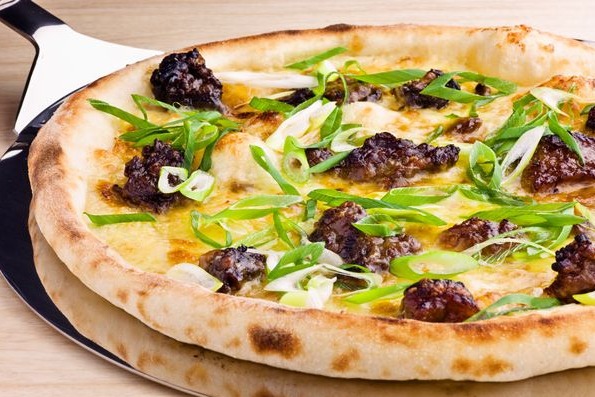 「七味生地牛すじたっぷり九条葱」ピリッと香る七味唐辛子を練り込んだ生地に、じっくり煮込んだとろとろの牛すじをたっぷりトッピングしました。