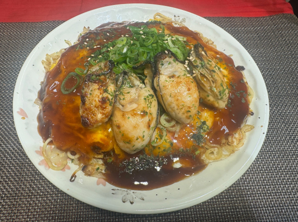 広島県産大粒牡蠣のガーリックオリーブ焼(2ヶ)と牡蠣のバター醤油焼(2ヶ)が入った一度に二度楽しいお好み焼きです。