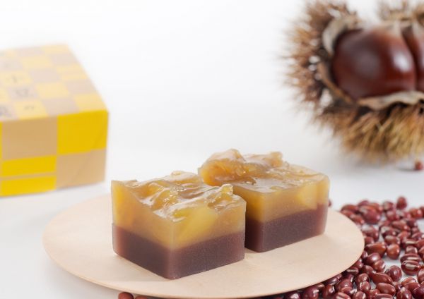 栗の甘露煮を入れた栗羊羹と北海道産小豆のこし餡羊羹を重ねました。