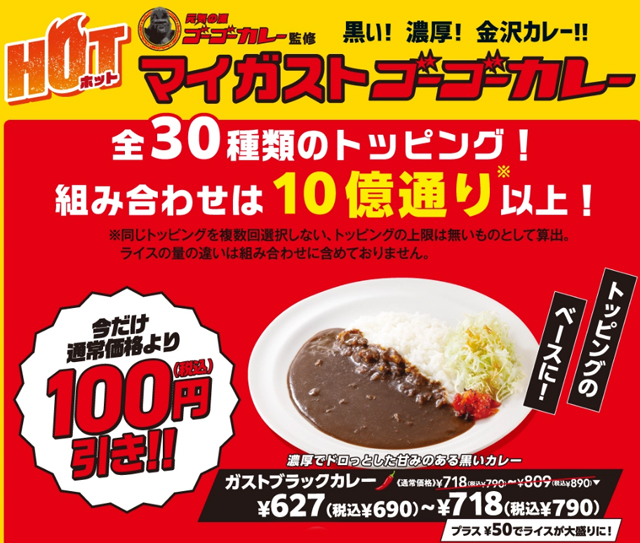 期間中は、ガストブラックカレーをはじめ「ガストブラックカレー元気盛り」・「ガストチーズINブラックカレー」・「ガストうすカツブラックカレー」が100円引きに!