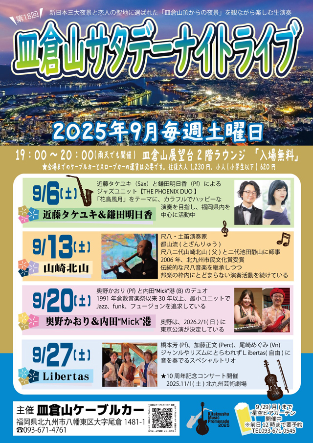 2025年9月毎週土曜日19:00~20:00、皿倉山展望台2階ラウンジ(屋内)にて「皿倉山サタデーナイトライブ」が開催されます。入場無料(※会場までのケーブルカー・スロープカーの運賃は必要)。