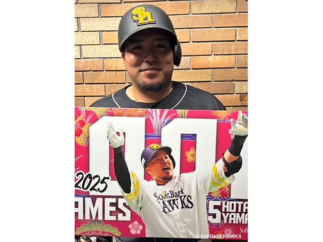 近藤健介選手が通算100本塁打・通算300二塁打を達成、山川穂高選手が通算1000試合出場を達成しました。これを記念して、ホークスジュニアアカデミーの野球振興チャリティーオークションにて、本人直筆サイン入りの記念パネルを出品中。