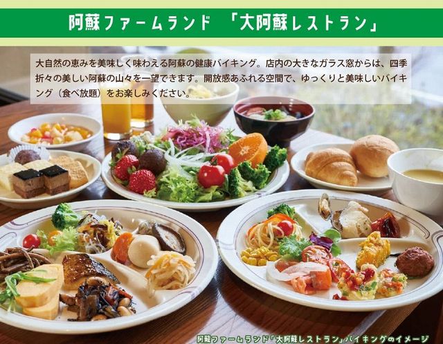 ・昼食は、阿蘇ファームランド「大阿蘇レストラン」にて、阿蘇の大自然の恵みをおいしく味わえるバイキングを用意。