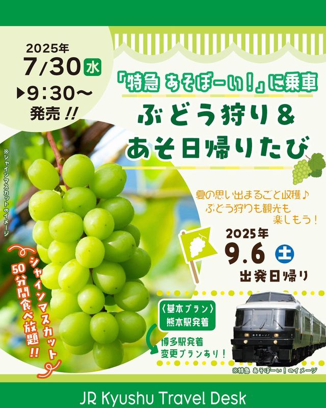 JR九州旅客鉄道株式会社は、2025年9月6日(土)に実施予定の、日帰り JR九州オリジナルツアー「特急 あそぼーい!」に乗車、ぶどう狩り&あそ日帰りたびを販売しています。