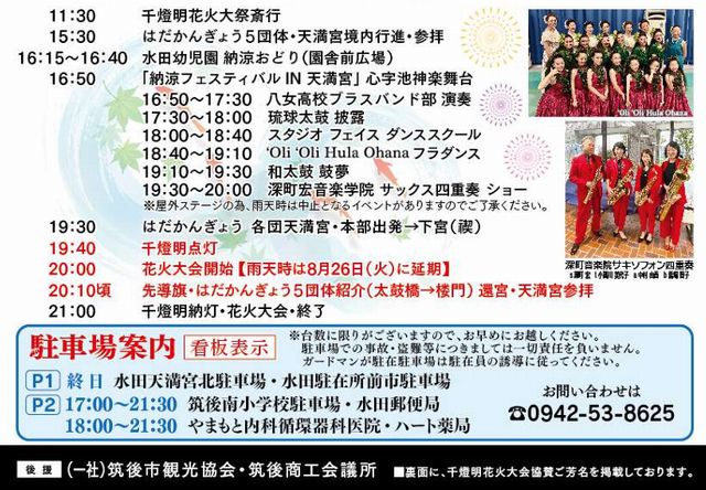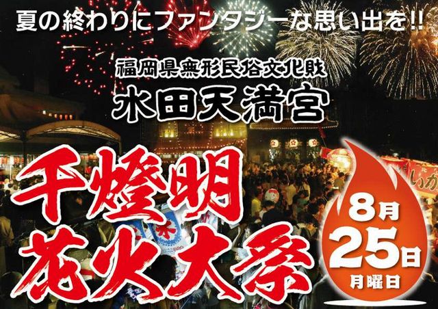 2025年8月25日(月)水田天満宮(筑後市水田62-1)にて1,000個の燈明で楼閣の姿が美しく浮かび上がる火祭り「水田天満宮千燈明花火大祭」が開催されます。