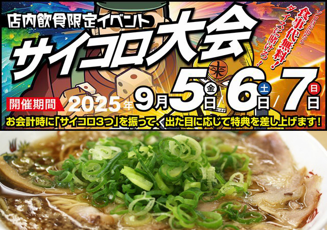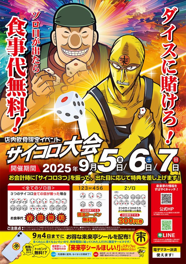 来来亭では、2025年9月5日(金)~9月7日(日)の3日間に「サイコロ大会」を開催します。会計時に「サイコロ3つ」を振って、出た目に応じて特典がもらえます。