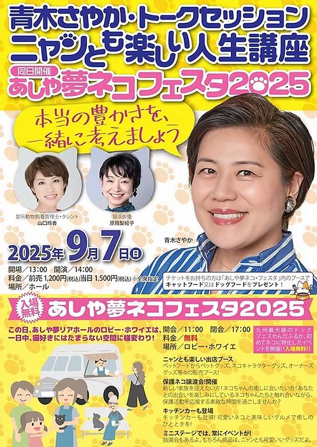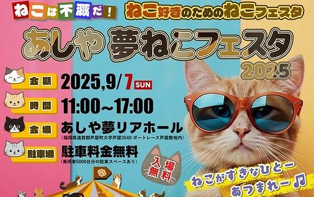 2025年9月7日(日)11:00~17:00、あしや夢リアホール(遠賀郡芦屋町芦屋3540 / ボートレース芦屋敷地内)にて「あしや夢ねこフェスタ2025」が開催されます。入場無料。