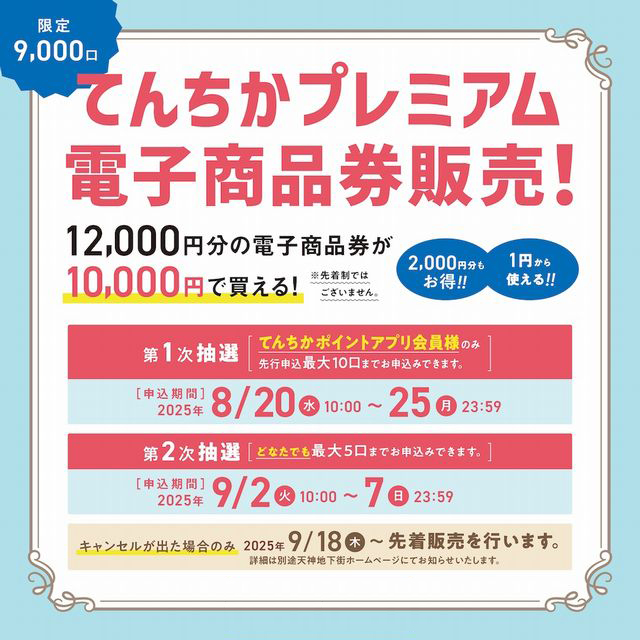 天神地下街で使える12,000円分の電⼦商品券を10,000円で購⼊できる「てんちかプレミアム電⼦商品券」を限定9,000⼝販売します。