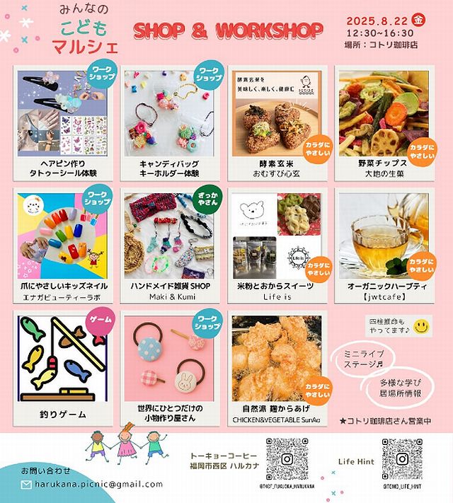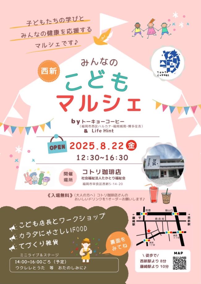 2025年8月22日(金)西新「コトリ珈琲店」(福岡市早良区西新5丁目)にて『みんなのこどもマルシェ』 が開催されます。入場無料。