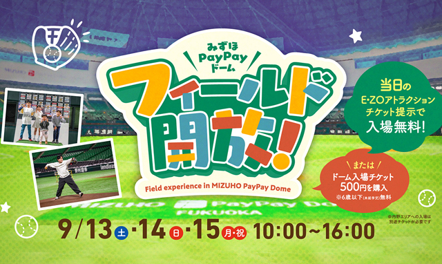 2025年9月13日(土)~9月15日(月・祝)の3日間、10:00~16:00(最終入場 15:40)、みずほPayPayドームのフィールドを開放!普段なかなか入ることができないフィールドで、キャッチボールや写真撮影などをが楽しめます。