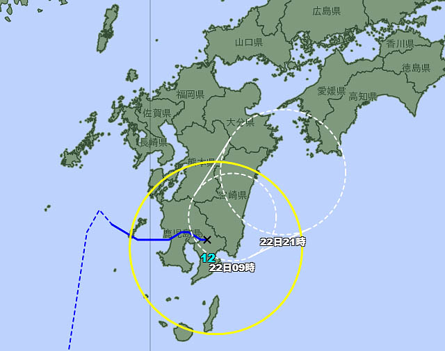 台風第12号は、今後、九州南部を東から北東へ進み、22日午後には日向灘に達し、熱帯低気圧に変わるでしょう。