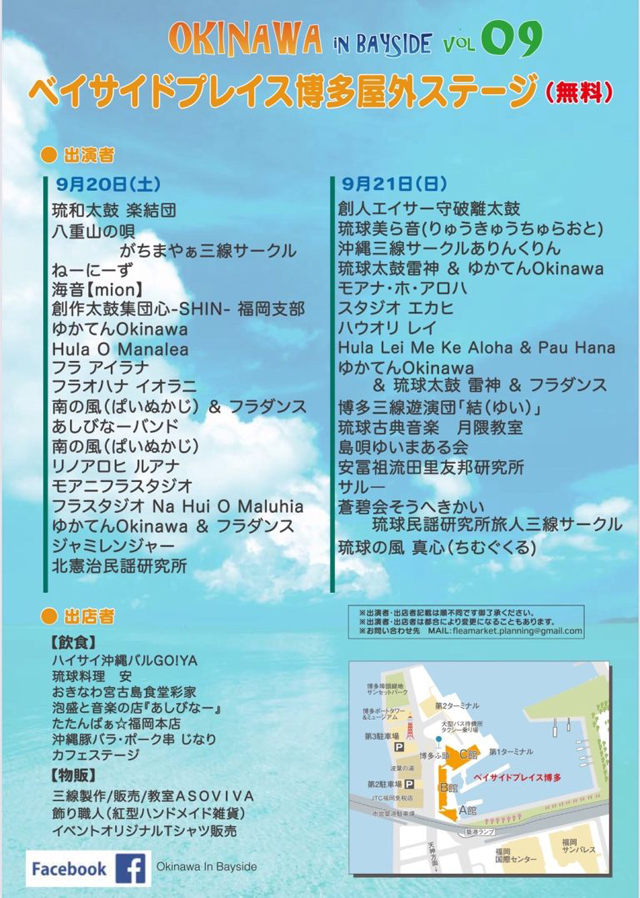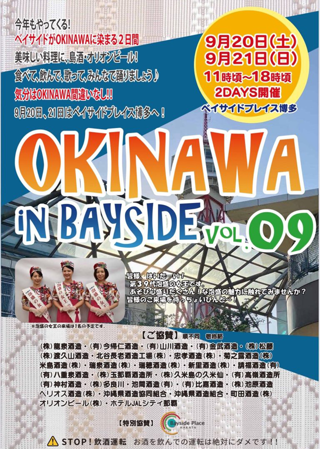 2025年9月20日(土)~9月21日(日)11:00~18:00、ベイサイドプレイス博多(福岡市博多区築港本町13番6号)海側イベントスペース 特設会場にて、「Okinawa In Bayside VOL.9」が開催されます。