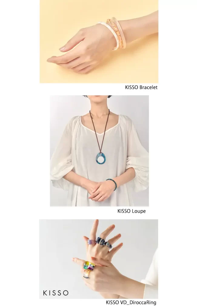 『“世界にひとつ”が見つかるアクセサリーブランド『KISSO』。色鮮やかでわくわくするアクセサリーです。カラフルで、かわいらしく、わくわくする。デザインが美しく、つけると軽くて肌にやさしく馴染むアクセサリーです。』
