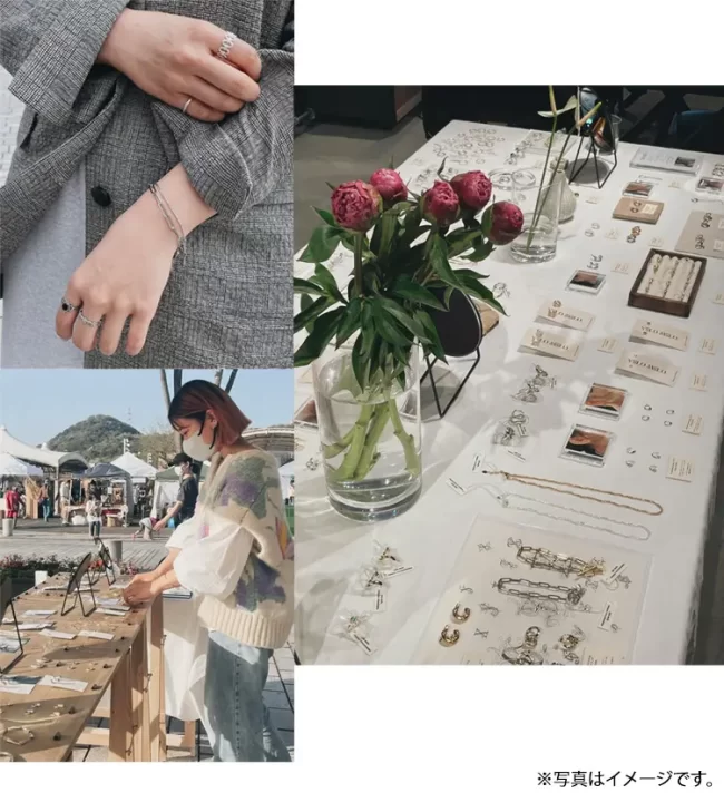 『シンプルな中にもトレンドを感じさせるデザインに。心ときめくハンドメイド&セレクトアクセサリーショップです。普段はオンラインショップでのみ販売のところ直接手に取ってお試しいただけます。より多くの方に楽しんでいただけるようすべてアレルギーに対応しております。』