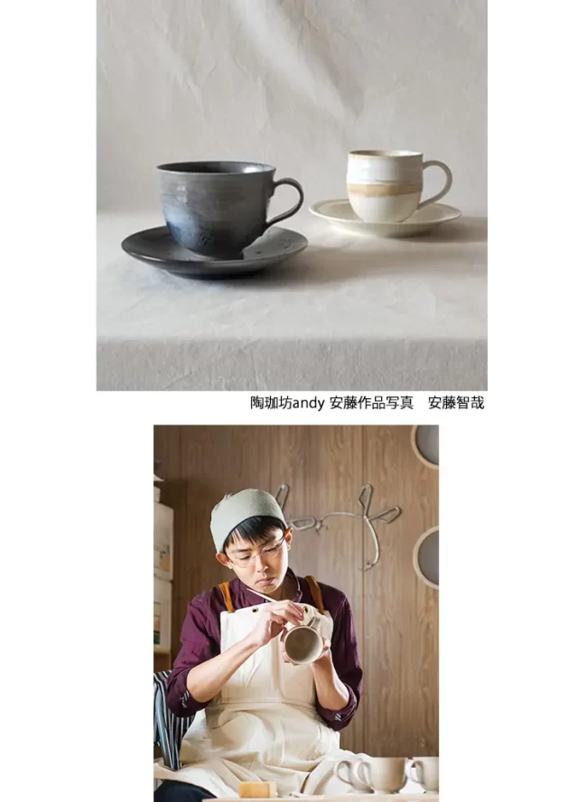 『珈琲と陶磁器の双方を焼いてこそ見えてくる双方の関係性の美学を追及するべく屋号を『陶珈坊andy(とうこうぼうアンディー)』とし、カップ&ソーサーやマグカップなどの珈琲のための器を中心に作陶を開始。自然農園で田畑を手伝うようになったことをきっかけに酒器や飯碗などにも取り組んでいます。』