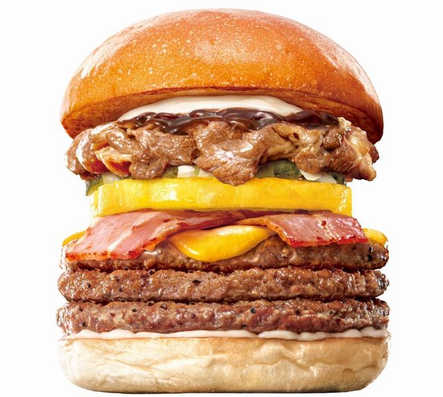 「キング牛カルビBBQパイン絶品チーズバーガー」は、贅沢に3枚重ねた牛肉100%のパティに、鉄板で焼いたパインや、甘めのソースで味付けした牛カルビ肉、自社製ベーコンを合わせ、フルーティーかつスモーキーな風味が特長のBBQソース、4種類のチーズをブレンドしたとろ~りチーズソースなどとともに、ふんわりもっちり食感のバンズで挟んだ一品。