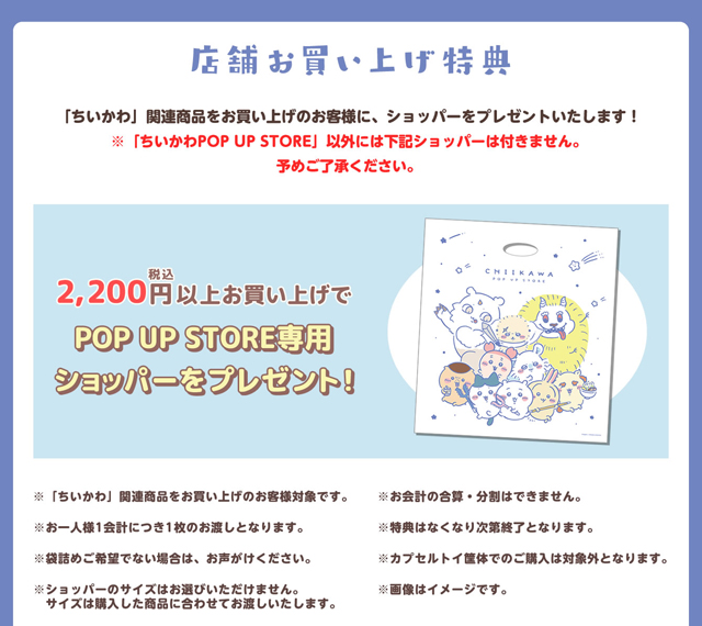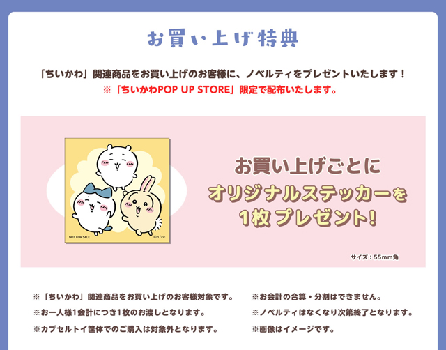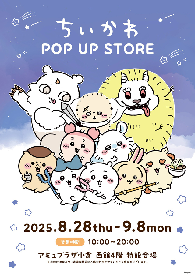 2025年8月28日(木)~9月8日(月)10:00~20:00、アミュプラザ小倉(北九州市小倉北区浅野1丁目1-1)西館4階 特設会場にて、「ちいかわ POP UP STORE」が開催されます。