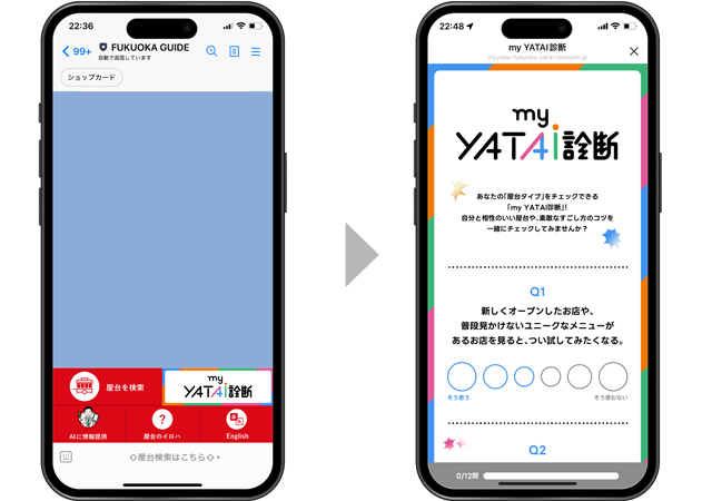 屋台のLINE公式アカウント「FUKUOKA GUIDE」に、性格診断のような感覚で自分にマッチする屋台を探せる新機能「my YATAI診断」が追加されました。
