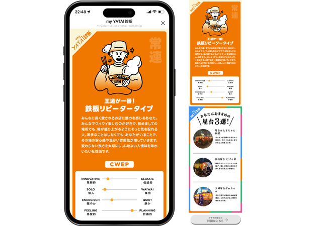 質問への回答をもとに、AI が、その方にマッチした屋台での楽しみ方や過ごし方を分析し、可愛らしいイラスト付きの診断結果を表示。「王道が一番!鉄板リピータータイプ」「じっくり楽しみたい!優しく見守りタイプ」など、16種類の診断結果があります。