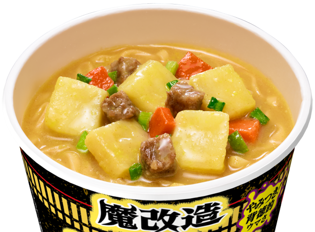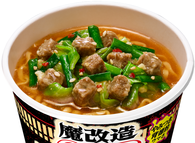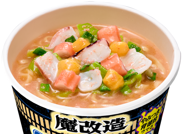 「魔改造カップヌードル」は、「カップヌードル」のスープをベースに、にんにくとニラの風味、肉の旨み、野菜の甘みをきかせた “もつ鍋しょうゆ味” が特長です。