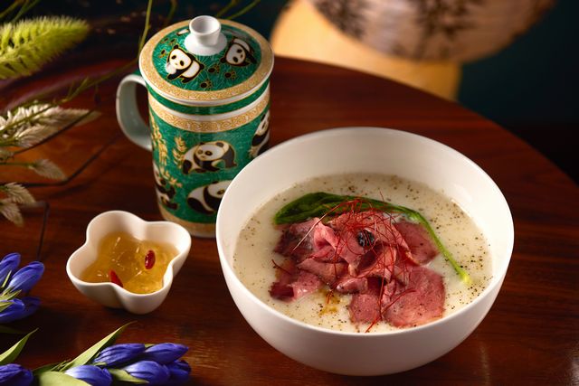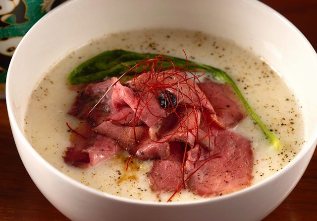チャイナカフェ人気の貝柱を使用した海鮮豆乳粥にローストビーフをトッピング。しっとりやわらかな赤身肉にソースは甜麺醤を加え中華風のローストビーフに仕上げています。