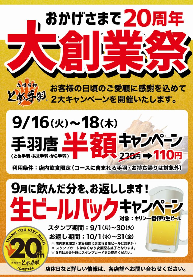 九州名物とめ手羽は20周年を迎えます。2025年9月1日(月)~9月30日(火)「20周年 大創業祭」2大キャンペーンを開催!