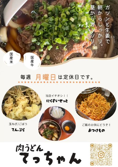 2025年8月26日(火)黄金市場から徒歩2分のところに「肉うどん てっちゃん」(北九州市小倉北区黄金1-10-17)がオープン。営業時間は6:00~14:00。月曜日は定休日。