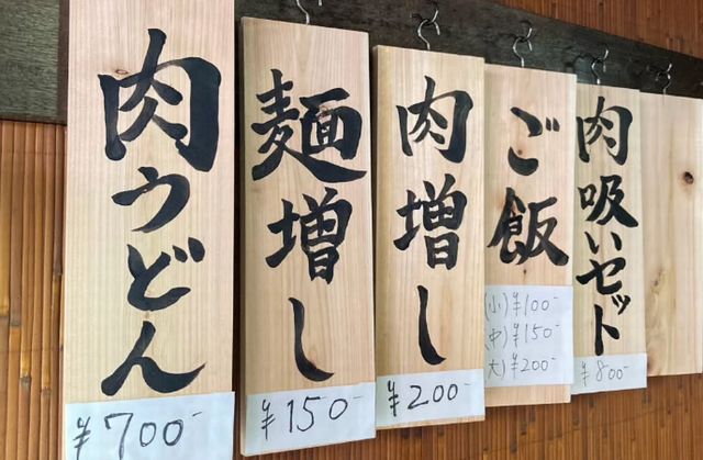 看板のメニュー「肉うどん」ガツンと生姜で朝からしっかり。昼からガッツリ。各種トッピングもあります。