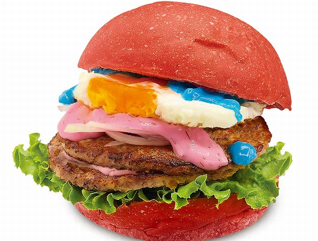 ジューシーなドムドムのパティが2枚、欠かせないレタスと目玉焼き。そこに、色鮮やかなブルーチェダーチーズと、かわいい色味のハーブ入りピンクトマトソースが絡みます。