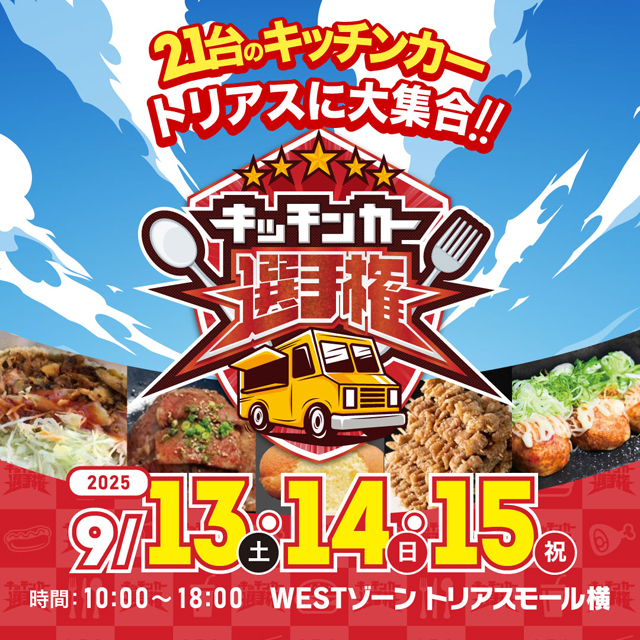 2025年9月13日(土)~9月15日(月・祝)10:00~18:00、トリアス久山 WESTゾーン(糟屋郡久山町山田1111 トリアスモール横)にて「FUKUOKAキッチンカー選手権」が開催されます。