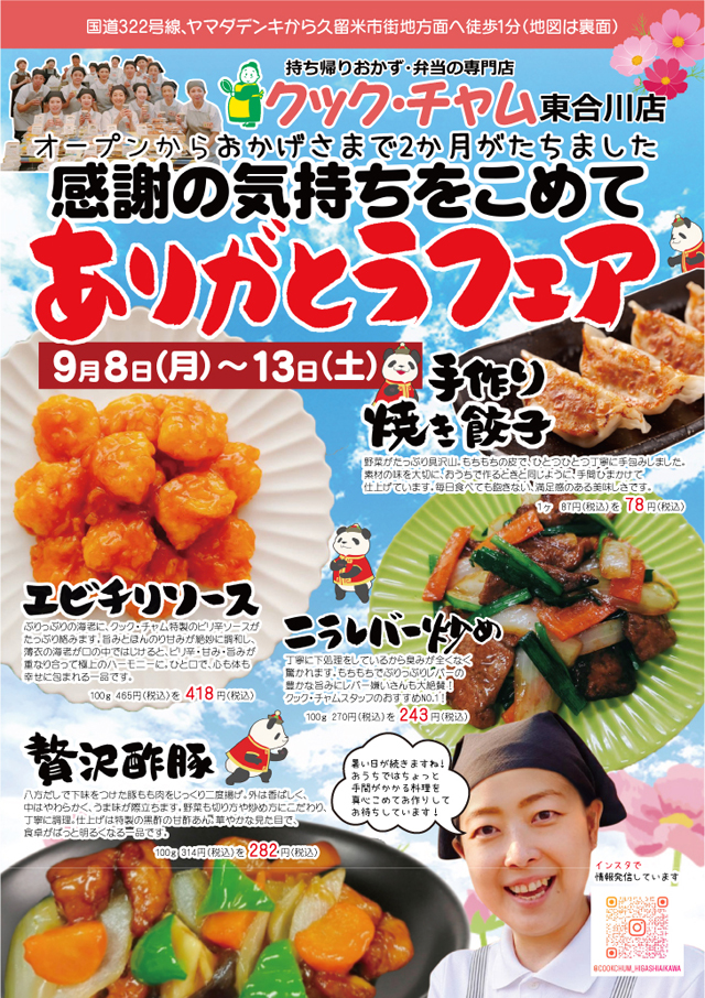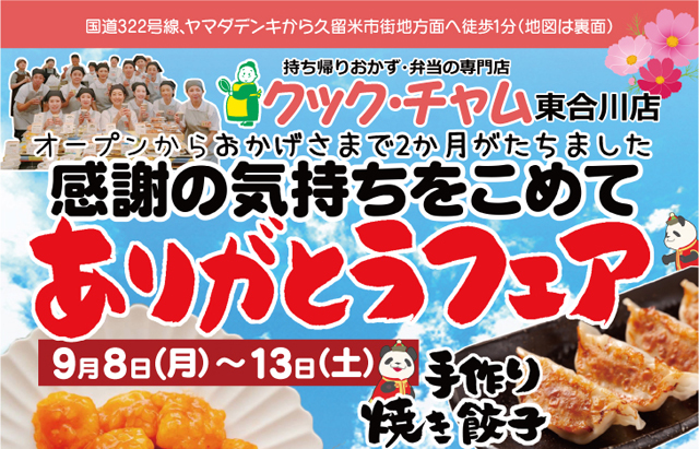 おかずとお弁当のお店「クック・チャム 東合川店」(久留米市東合川3丁目18-22)が、2025年7月7日(月)にオープンして2ヶ月、日頃の感謝の気持ちを込めて「ありがとうフェア」を開催。