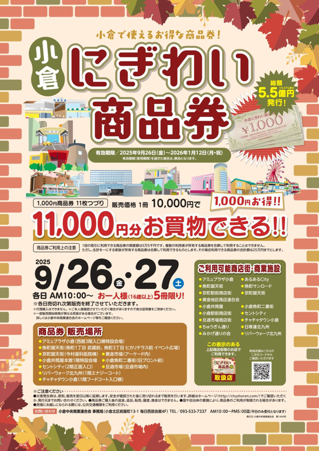小倉中心市街地の商店街と大型商業施設で構成する商業団体・小倉中央商業連合会は、プレミアム商品券「小倉にぎわい商品券」を発行します。