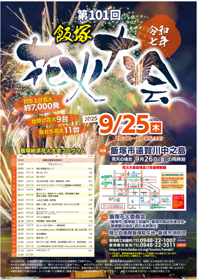 2025年9月25日(木)20:00~21:10(予定)飯塚の夏の風物詩、筑豊の一大イベント「第101回 飯塚納涼花火大会(約7,000発)」が開催されます。※荒天の場合9月26日(金)