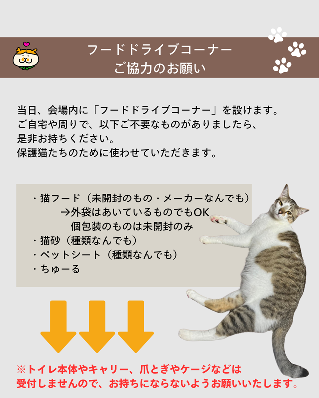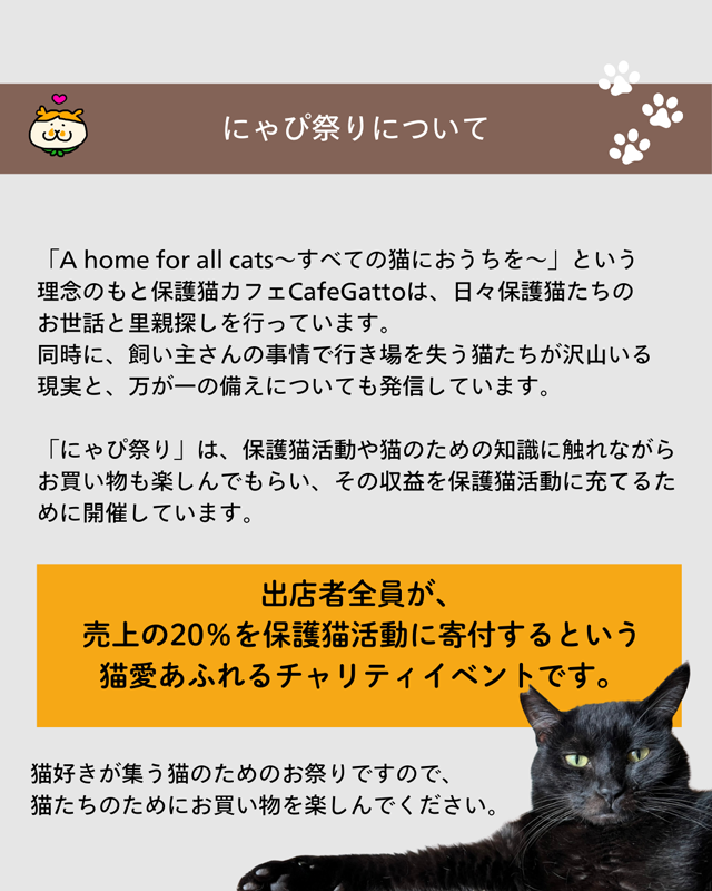 猫雑貨やハンドメイド雑貨がいっぱい!キッチンカーやスイーツも!各地より60の出店者が大集合します。出店者全員が売上の20%を保護猫活動に寄付する、猫愛溢れるチャリティイベントです。